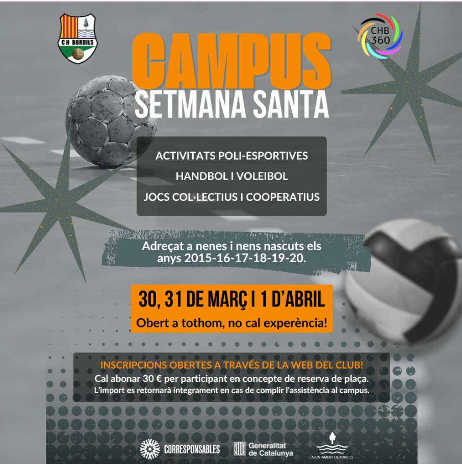 D’aquí a poques setmanes arriben uns dies de descans escolar, però no esportiu, perquè des del club volem informar-vos que enguany, i per segon any, realitzarem el Campus de Setmana Santa, durant elsdies 30, 31 de març i 1 d’ abril. Serà un espai per nenes i nens de fins a 11 anys, on es combina la pràctica del’handbol i del volei, però també es realitzaran jocs col·lectius i cooperatius entre el grup participant.